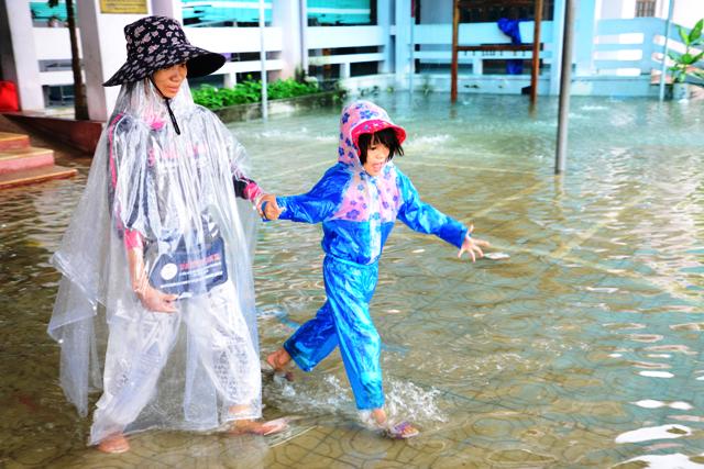 Năm nay ngày Nhà giáo rơi vào ngày mưa gió, sân trường ngập nước, cha mẹ tranh thủ đón sớm