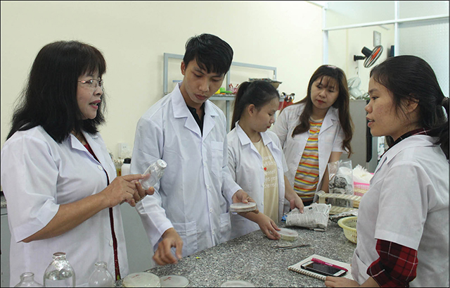PGS. TS. Hoàng Thị Kim Hồng (ngoài cùng bên trái) hướng dẫn sinh viên thực hành thí nghiệm