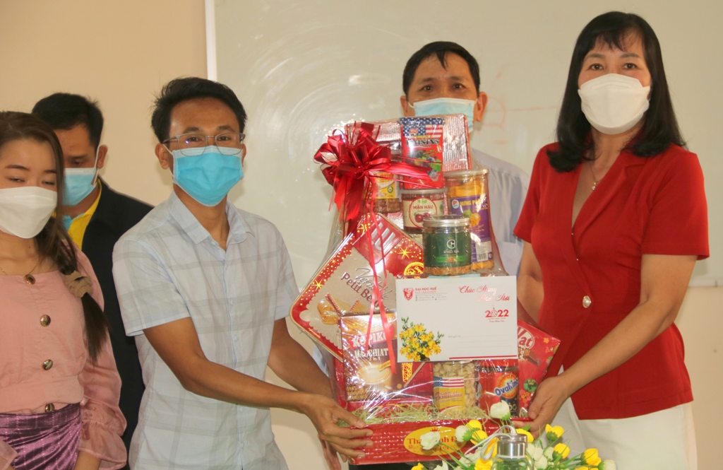 TS. Đỗ Thị Xuân Dung, Phó Giám đốc ĐH Huế cùng đoàn của ĐH Huế tặng quà, chúc tết lưu học sinh Lào