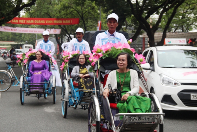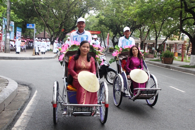 Nhiều bà mẹ lớn tuổi với trong trang phục áo dài truyền thống thích thú được ngắm TP. Huế miễn phí bằng xích lô
