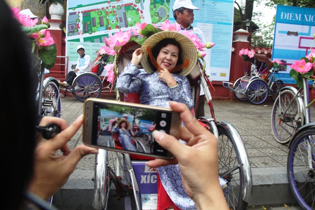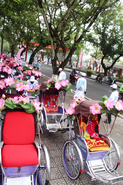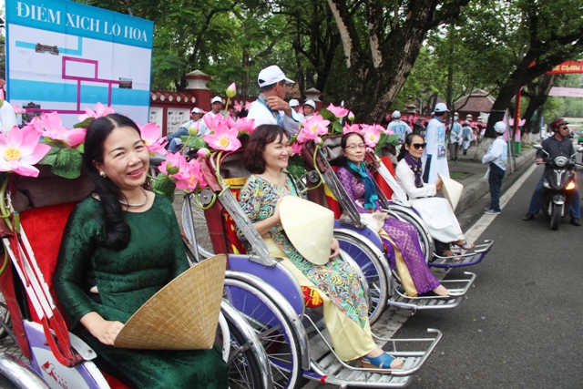 Hơn 100 chiếc xích lô được trang trí hoa sen được BTC Festival Nghề truyền thống Huế 2017 bố trí để chở miễn khí du khách và người dân mặc áo dài