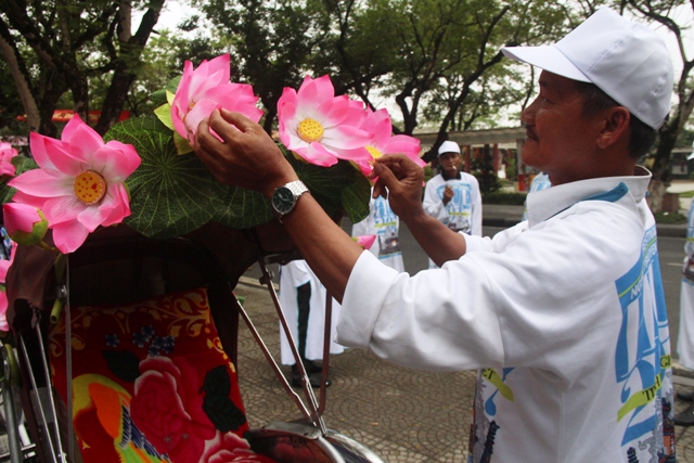 Một bác tài xích lô tranh thủ lúc rảnh rỗi trang cho chiếc xe của mình