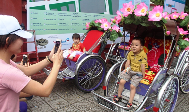 Nhiều bà mẹ cùng con nhỏ qua đường tranh thủ chụp hình lưu niệm bên những chiếc xích lô được trang trí sắc hoa
