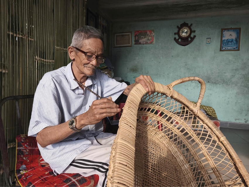 | Ông Trần Văn Thành chăm chút từng đường đan nôi mây trên phố Lê Duẩn |