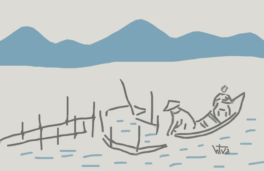 Người đàn ông thả xong những tay lưới xuống khu vực nước sâu nhất thì neo thuyền lại, tranh thủ nằm chợp mắt. Chiếc nón lá úp lên khuôn mặt sạm đen, che lại thứ ánh sáng xám xịt từ bầu trời. Tiếng con cu gáy vọng đến từ bên kia sườn núi, khiến chiều trở nên mênh mông, nỗi buồn bất chợt đến như một vết dầu loang trên mặt nước.