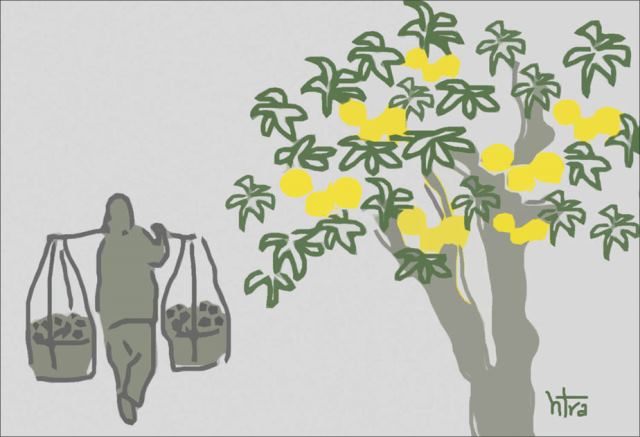 Hôm nay ra phố, bất ngờ gặp quả trứng gà vàng ươm được bán ở góc đường. Bà cụ gánh hai mủng quả vừa chín tới, bước chân thong dong thả chậm trên vỉa hè phủ đầy lá vàng rơi và cả những mảng rêu xanh mướt. Ai đó vội vã dừng xe đứng lại cuối góc đường, đón lấy nụ cười móm mém già nua mà rạng rỡ. Cái dáng cong cong của bà cụ, vậy mà khiến mình nhớ dáng ngoại lom khom ở quê nhà. Nắng mùa đông lả lướt rớt xuống phố mênh mông, đậu lên mủng quả quê vừa chín tới ngọt lành. Chỉ vậy thôi mà cả một trời tuổi thơ cứ ùa về trong thương nhớ.