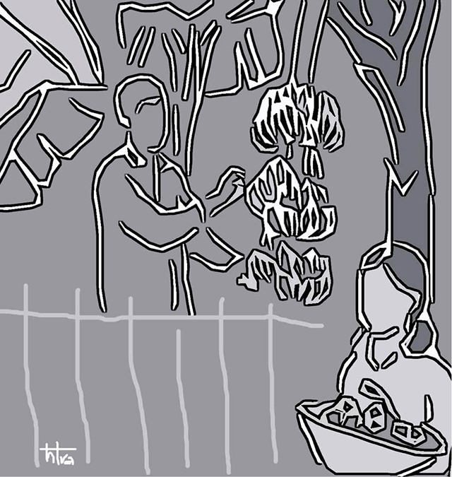 Mùi cỏ hăng, mùi đất nữa ở mấy ô đất mà bác nông dân đào để trồng mấy cây chuối con, làm nồng lên khoảng vườn buổi sáng. Câu chuyện rủ rỉ cũng chỉ loanh quanh chuyện đất, chuyện cây và những người bạn vườn giờ hoặc đã già cả, hoặc xuôi theo con cháu ở xứ người. Tôi nghe và nghĩ, không biết có lúc mô sau khi lụi hụi một mình, bác Lịch – tên mà bác nông dân vừa giới thiệu – lại trò chuyện với cây chuối, cây quýt, bình tinh… như đã từng trò chuyện với những người hàng xóm hàng ngày cùng nhau vác cuốc ra thăm vườn không…?