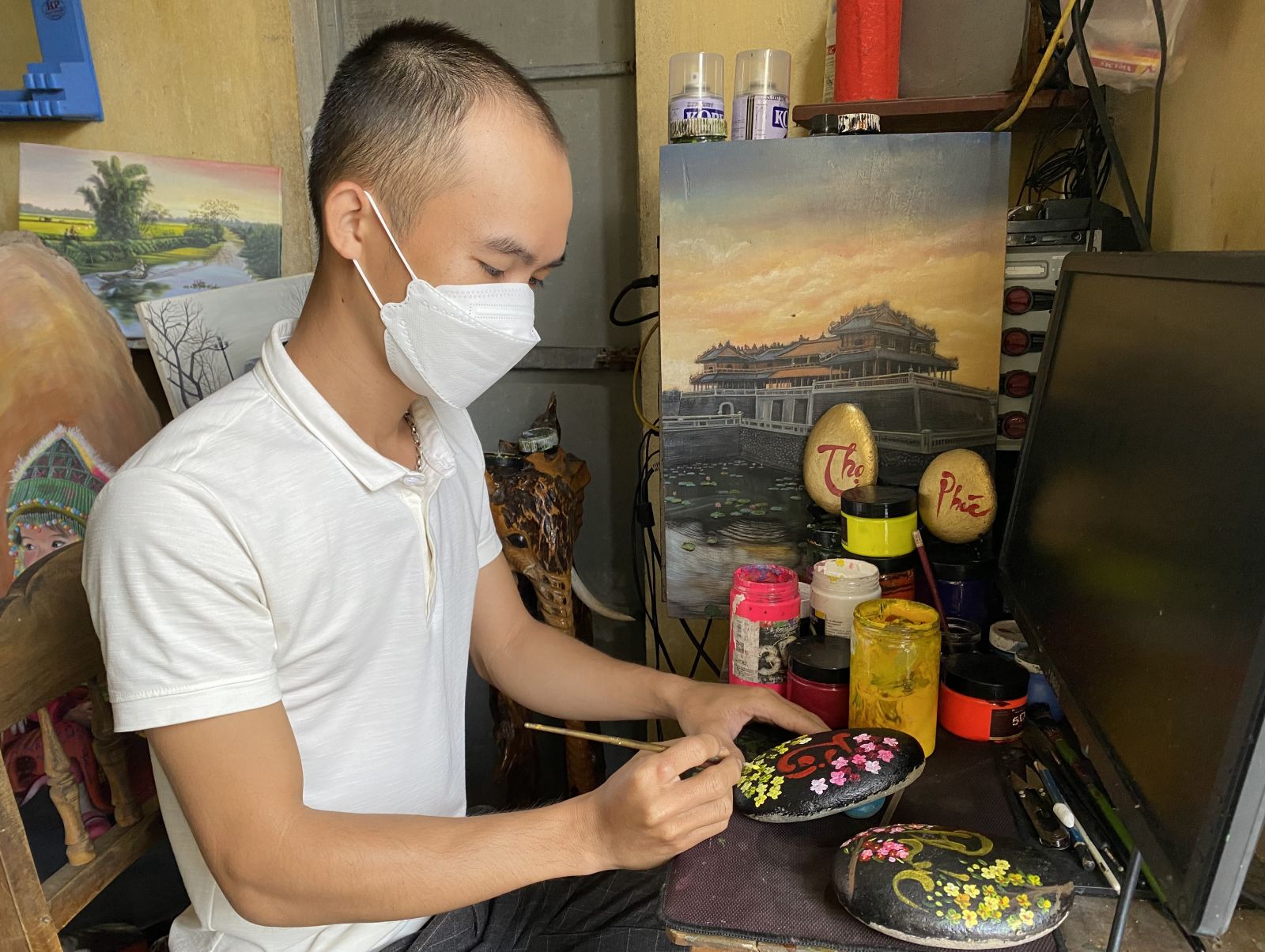 Nguyễn Văn Tiên tự tay vẽ những bức tranh sỏi để tặng người thân, bạn bè