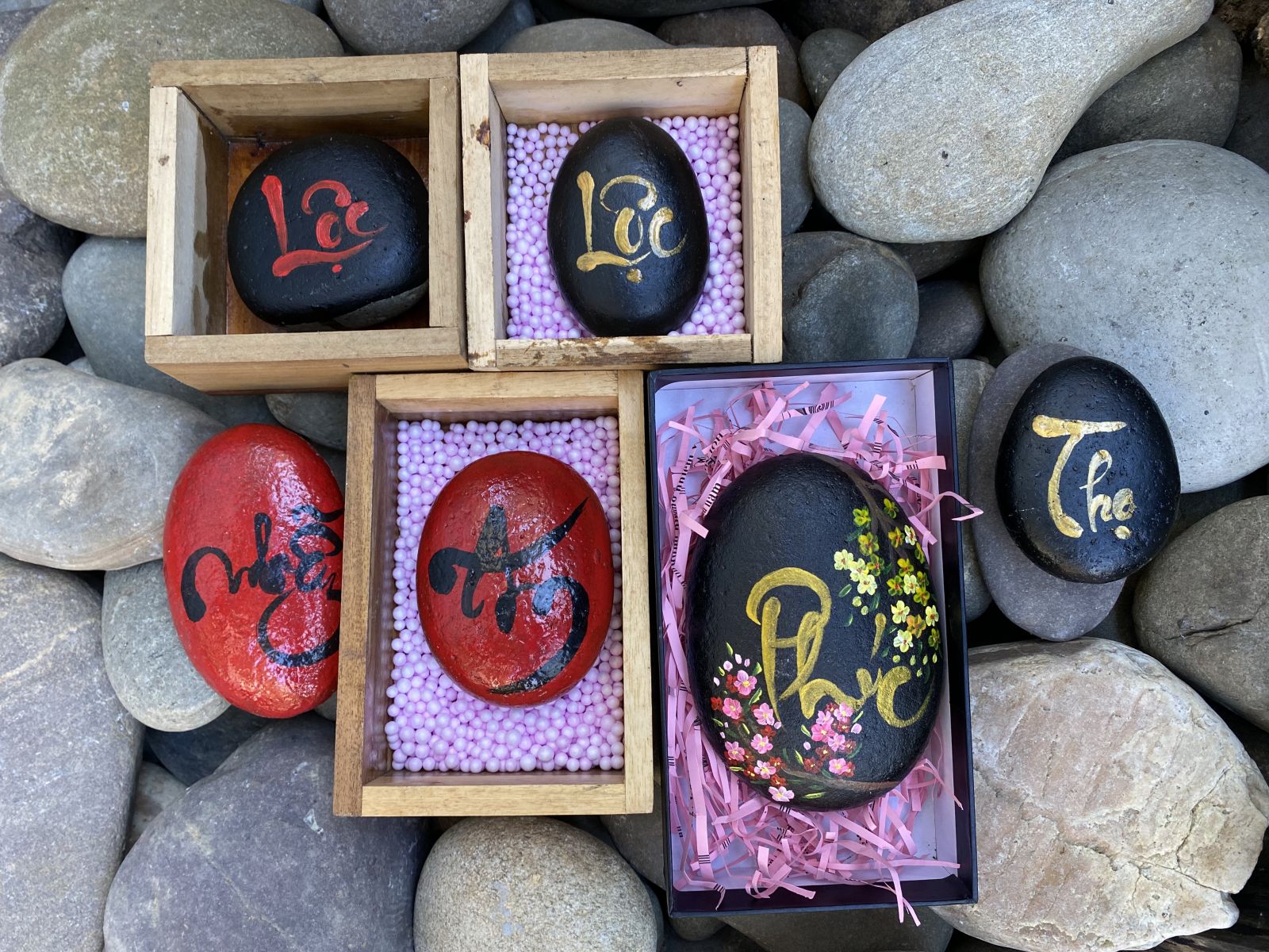Gần 10 năm gắn bó với Huế, năm nay, Nguyễn Văn Tiên, chàng họa sĩ trẻ quyết định vẽ thư pháp trên sỏi để đón chào năm mới. Được chắp bút bằng màu acrylic trên nền đá, những bức thư pháp tuy nhỏ nhắn mang đến lời chúc tốt đẹp, ấm áp cho người nhận. Trung bình với mỗi viên sỏi, Tiên mất trên 30 phút để hoàn thiện. Ngoài chọn những viên sỏi có bề mặt trơn nhẵn, anh phải chắt lọc, lựa để hình dáng của sỏi càng tròn trịa càng tốt.