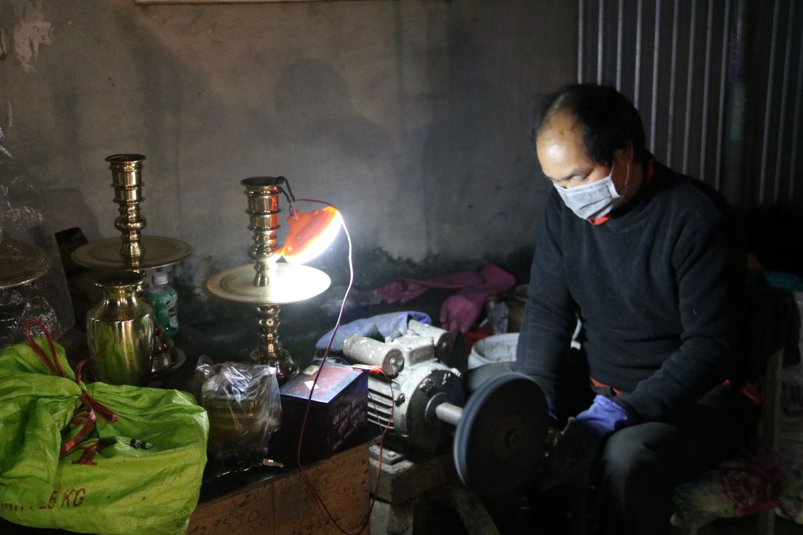Cũng có những người “tăng ca” đêm, tranh thủ “nghề hot” ngày giáp Tết để lo Tết cho gia đình mình. Anh Nguyễn Văn Quảng, làm nghề đánh bóng lư đồng kể, những ngày thường, anh làm thợ hàn nhưng cận tết lại gác việc, chuyển tạm sang nghề này để cải thiện thu nhập. Ngồi ở đầu kiệt, chỉ với cây đèn sạc bình ắc quy, anh tạm quên không khí tết đang qua lại trên đường để tập trung công việc và nhận thêm hàng của khách. Ảnh bảo: “Lấy ngày làm đêm, mỗi ngày cũng kiếm được 300.000 - 400.000 đồng, lo bữa ăn và sắm tết cho 4 đứa con”.