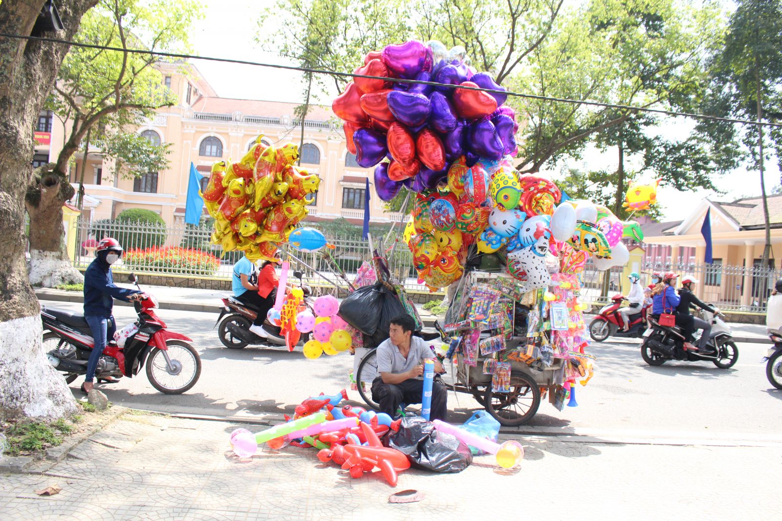 Mệ Thai tâm sự, chồng mệ năm nay đã 73 tuổi, ông bị tai biến nên chỉ có thể quanh quẩn ở nhà, con cái ở xa lại cực khổ nên không giúp được cha mẹ. Vậy là hai thân già làm việc nuôi lấy nhau. Ông ở nhà bơm bong bóng, mệ lọc cọc đạp xe chở từng chùm bong bóng thắm tươi đem bán. “Được cái Tết năm nay trời tạnh ráo, người ta đi chơi nhiều nên dễ bán. Có người thương vừa mua bóng giúp, lại mừng tuổi cho mệ thêm ít tiền”, vừa tháo bóng ra bán cho khách, mệ vừa nói.
