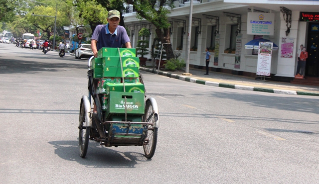 Diễn biến của nắng nóng năm nay được xem là bất thường. Trong ảnh, một người đàn ông đạp xích lô chở hàng hóa trên đường Lê Lợi giữa trưa, trong khi đó gần nhưng vắng bóng người đi đường