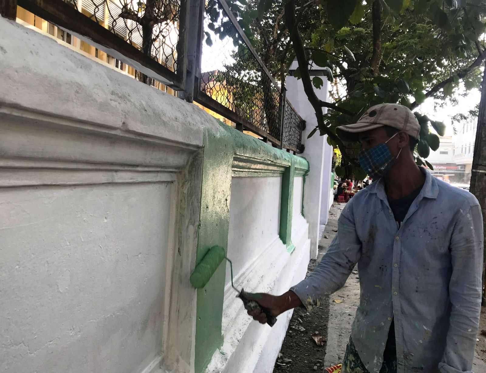Trong khu vực sơn nhà, tất cả đồ đạc được nhóm thợ sơn của anh Nam che chắn cẩn thận. Trước khi sơn, anh cũng cho thợ vệ sinh toàn bộ mặt tường để sơn bám dính tốt hơn. Từ xả lớp sơn cũ, matis cho đến lăn sơn, những người thợ sơn làm rất cẩn thận.