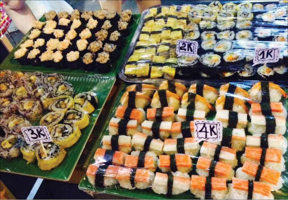 Để mà nói cho đúng, thì cũng như mì cay, các món ăn uống trào lưu này cũng theo thời tiết, phim ảnh và độ hot để xem xét quy mô, cách thức phục vụ và giờ giấc mở cửa. Về cái vụ này, lứa trẻ cỡ tuổi học sinh là rành và hào hứng nhất. Ví như vào các buổi học sáng, để phục vụ các cô cậu, ngủ nướng kịp giờ đến trường, các quán sushi, cơm cuộn 1.000-2.000 đồng mở ra nhiều vô tận trước cổng trường cấp hai, tiểu học. Tụi nhỏ có vẻ thích dữ lắm, vì vừa khác ổ mì, tô bún mẹ dỗ mãi mới ăn ở nhà, mà lúc cầm cũng nhìn sang sang, chảnh chảnh nên đứa nào cũng hào hứng chọn. Rồi đến chiều, tối là thấy các bạn tập trung lũ lượt ở mấy dãy đồ nướng Bà Triệu, xe cơm nắm Koi Lý Thường Kiệt rồi. Ba mẹ lúc này cũng chẳng lo lắng nhiều nữa vì dễ mà biết con mình ở đâu. Nếu gọi không được là cứ lái xe đến, kiểu gì cũng nom thấy các cô cậu qua lớp khói mờ và đục ngầu mùi tương, ớt, muối, vừng.