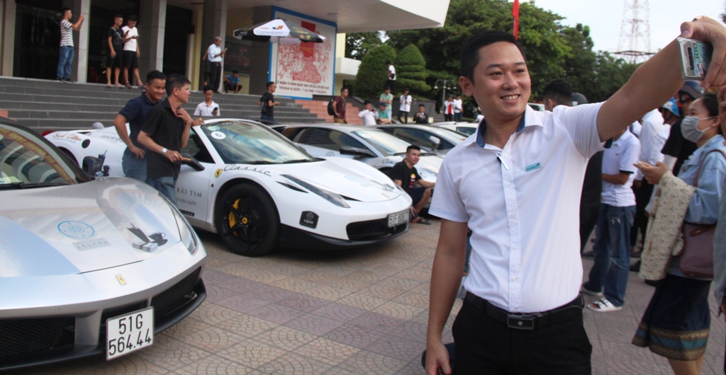Một bạn trẻ thích thú chụp ảnh bên chiếc siêu xe yêu thích