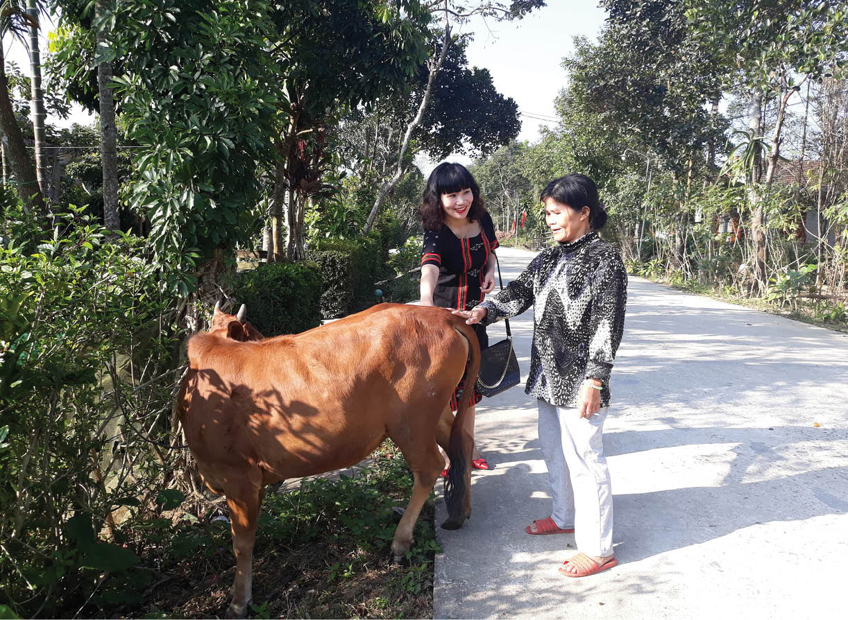 Chị Ánh (trái) thường xuyên đến thăm, nắm tình hình chăm sóc con bò giống do các mạnh thường quân hỗ trợ gia đình cụ Đoàn