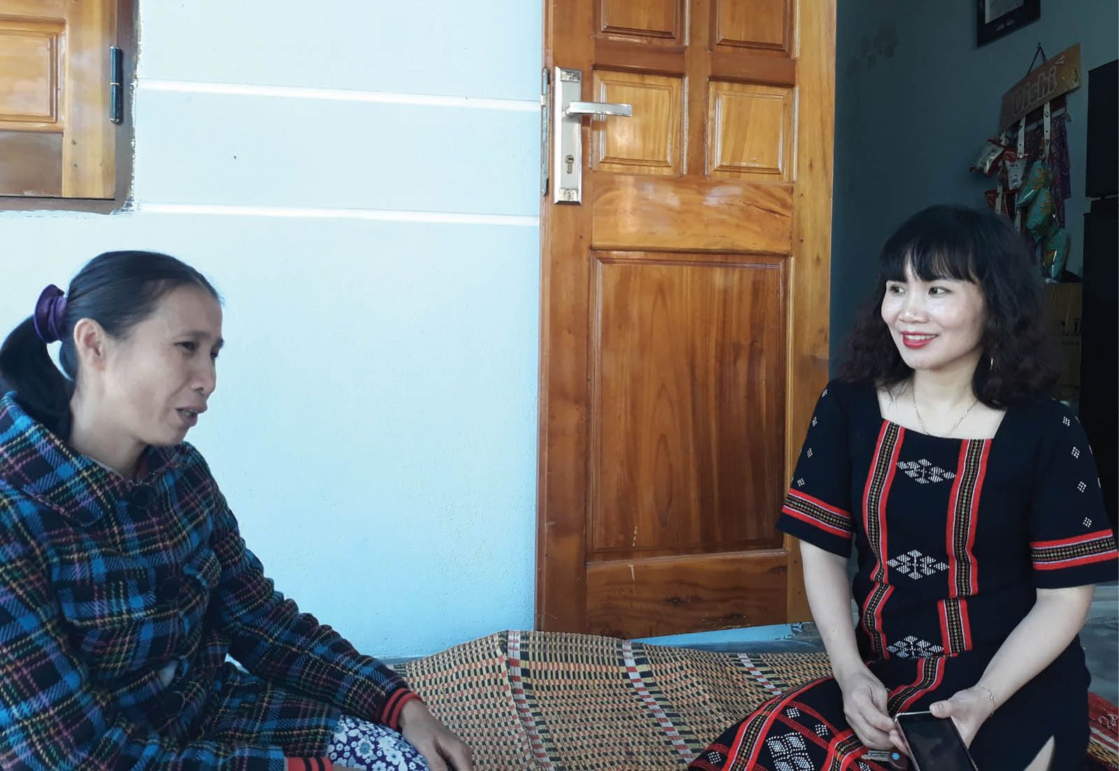 Chị Tiền (trái) xúc động trao đổi về cuộc sống tốt đẹp sau khi được hỗ trợ với "người vác tù và" Bùi Thị Ngọc Ánh (phải)