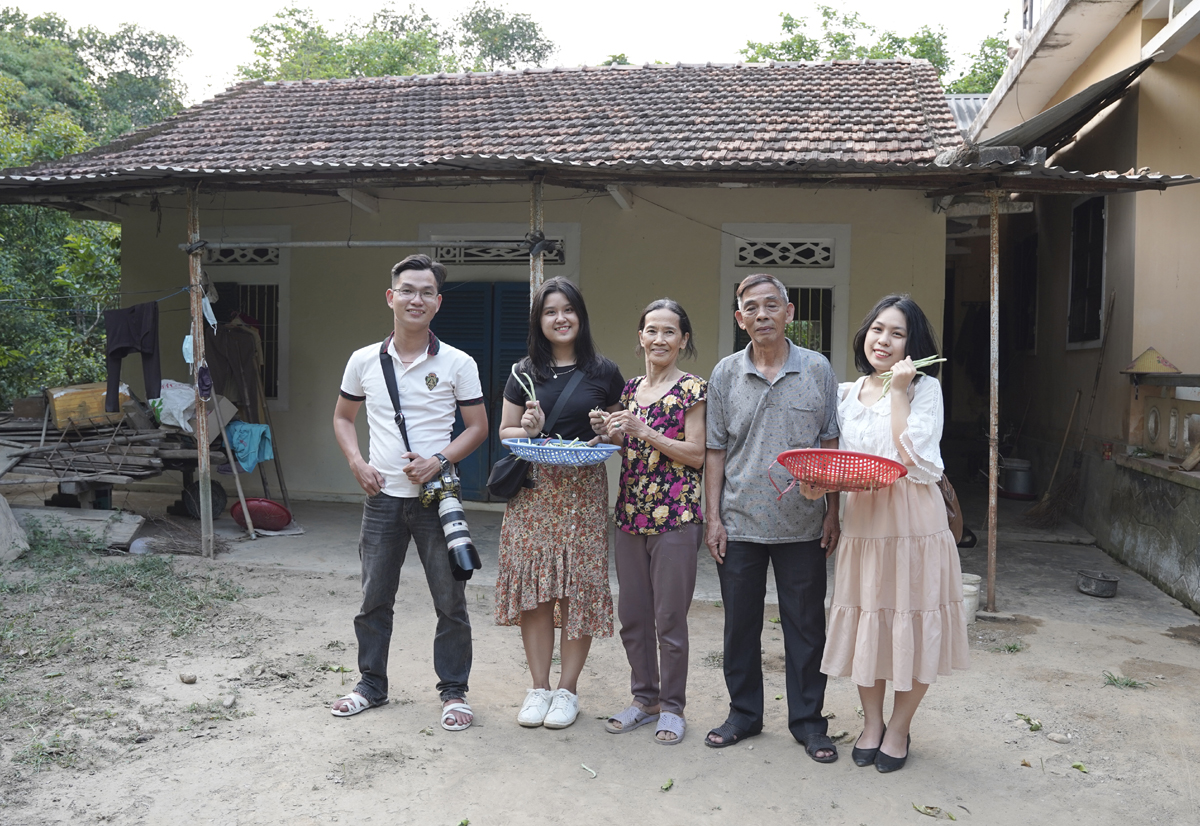 Các bạn trẻ chụp ảnh lưu niệm với ông Dũng - bà Tuyết. Ảnh: Phan Thắng