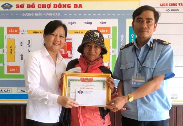 Trưởng ban Quản lý chợ Đông Ba - Hoàng Thị Như Thanh trao giấy khen và tiền thưởng đến người bán vé số dạo không tham của rơi