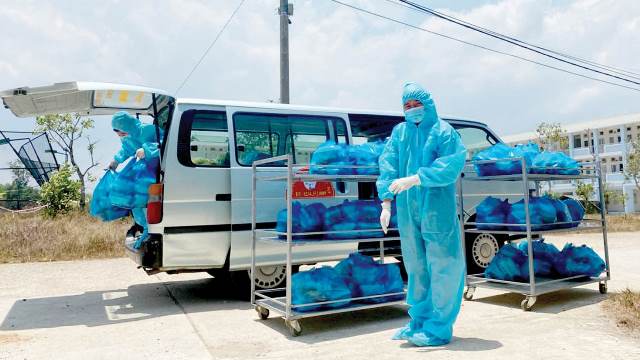 Đội ngũ phục vụ đưa cơm đến cho các bệnh nhân