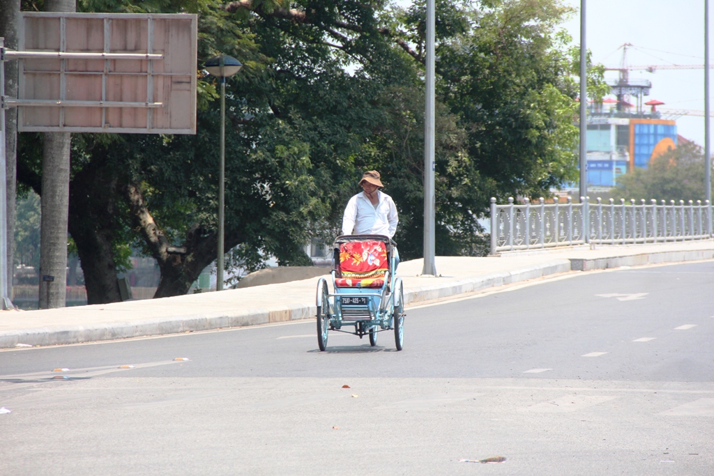Có những thời điểm trên đường phố gần như vắng bóng người, chỉ một vài người lao động vì công việc buộc phải di chuyển. Trong ảnh, một lái xe xích lô với vẻ mặt mệt mỏi đang cố đạp thật nhanh để trốn cái nắng gay gắt