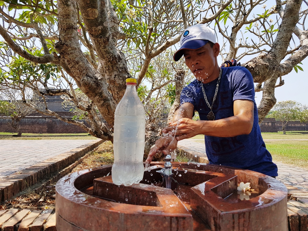Một người đàn ông lấy nước ở vòi nước công cộng để dùng, ngoài ra tranh thủ làm mát đôi bàn tay. Người này cho biết, phải uống nước rất nhiều trong những ngày qua để vừa giải nhiệt, vừa đảm bảo sức khỏe, chống chọi lại với nắng nóng