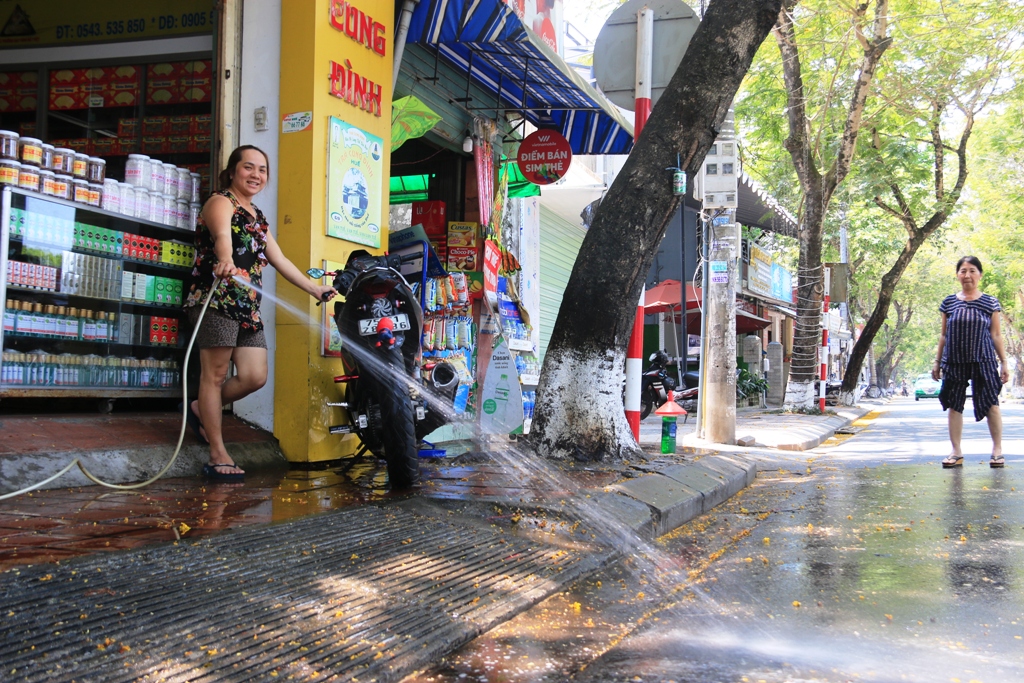Để làm giảm nhiệt, một vài nhà dân dùng nước tưới liên tục từ trên mái nhà đến xuống mặt đường