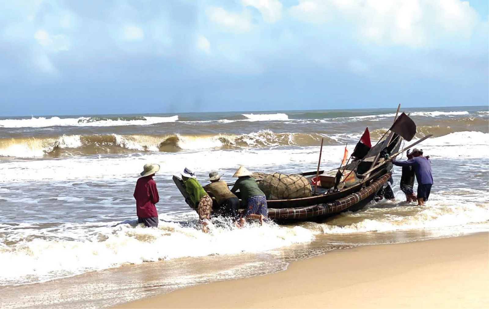 Trên bờ biển tấp nập, náo nhiệt, những người phụ nữ vội vàng chạy ra hướng biển để đón thuyền của mình về, phụ quay thuyền, mang cá lên bờ. Thấy thuyền của ba nhấp nhô rẽ sóng vào bờ, tôi cũng vội xách đôi dép theo mẹ ra đón. Trở về sau chuyến biển mệt nhọc, nhưng thấy những người phụ nữ của mình phấn khích ra phụ, ba và dượng vẫn không quên nở nụ cười thật tươi, cùng câu nói tếu: “Hai anh em tui đi cả sáng được chừng ni, chừ “nộp” lại cho hai “mụ” đó”.