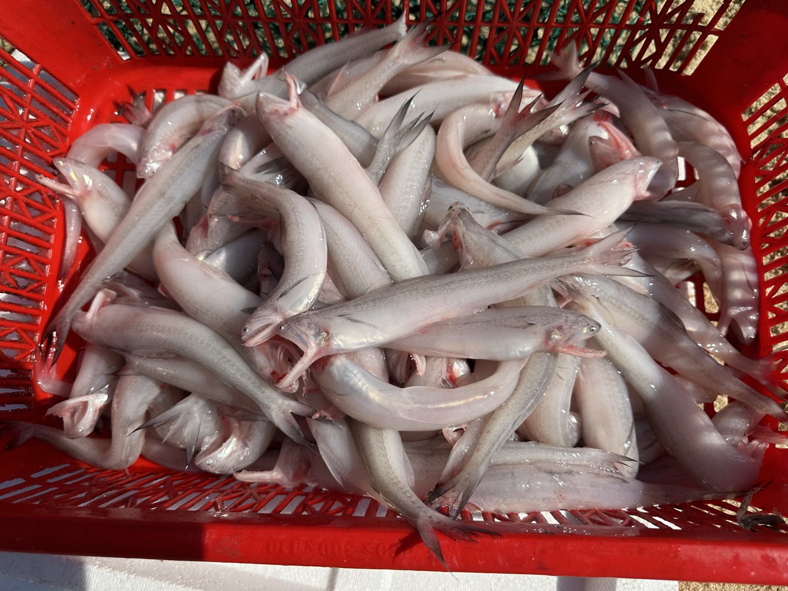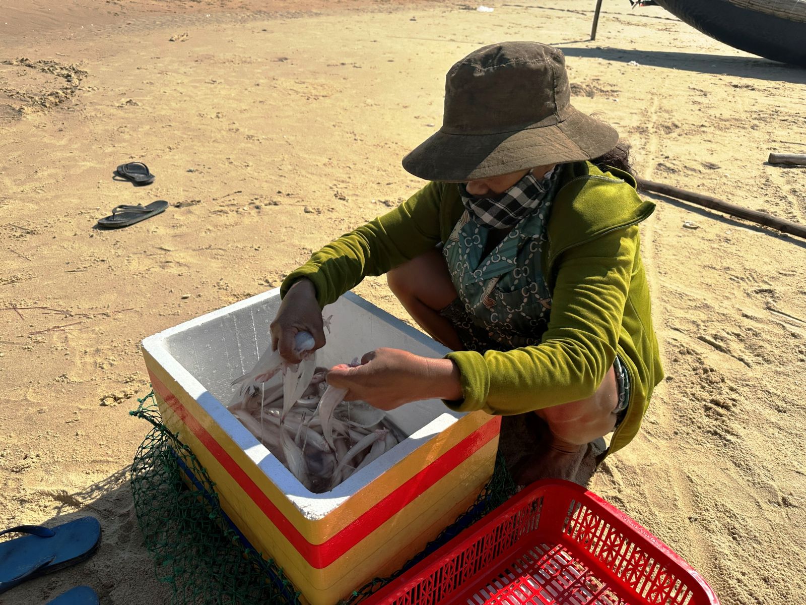Thuyền anh Lê Văn (Thôn Cự Lại Trung), xã Phú Hải vừa cập bến thì bạn hàng đã chờ sẵn để thu mua cá. Thùng xốp được gánh xuống khỏi thuyền, mở ra là những con cá căng (cá ong biển), cá khoai tươi rói, óng ánh.