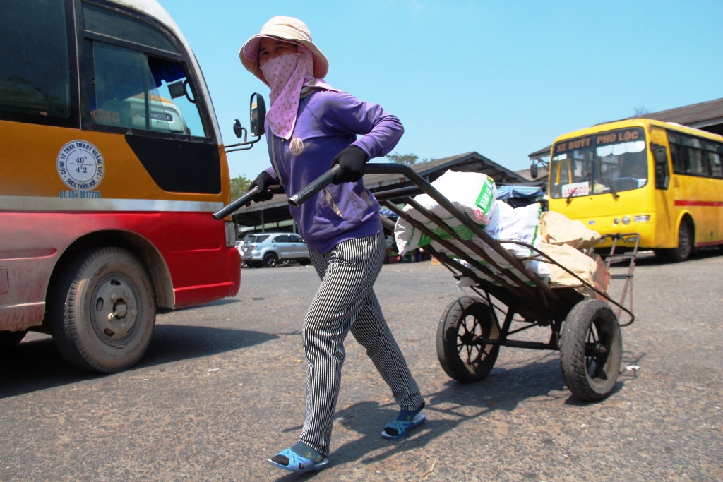 Những hình ảnh về những người phụ nữ làm nghề đẩy xe, bốc vác hàng ở bến xe bên trong chợ Đông Ba vô cùng quen thuộc với mọi người