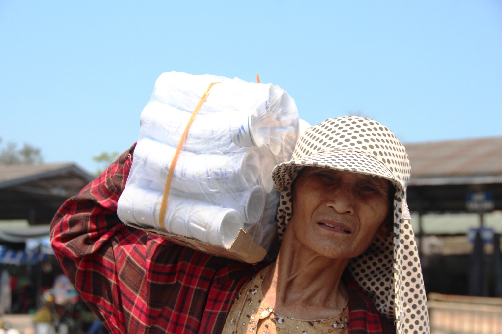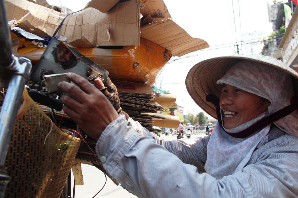 Nụ cười rạn rỡ của chị Nguyễn Thị Thanh Tuyền trong lúc chất hàng ve chai lên xe đạp. Chị Tuyền 52 tuổi, nhà tận Phú Bài, Hương Thủy. Gần chục năm nay, chị rong ruổi khắp các nẻo đường TP. Huế để mua ve chai