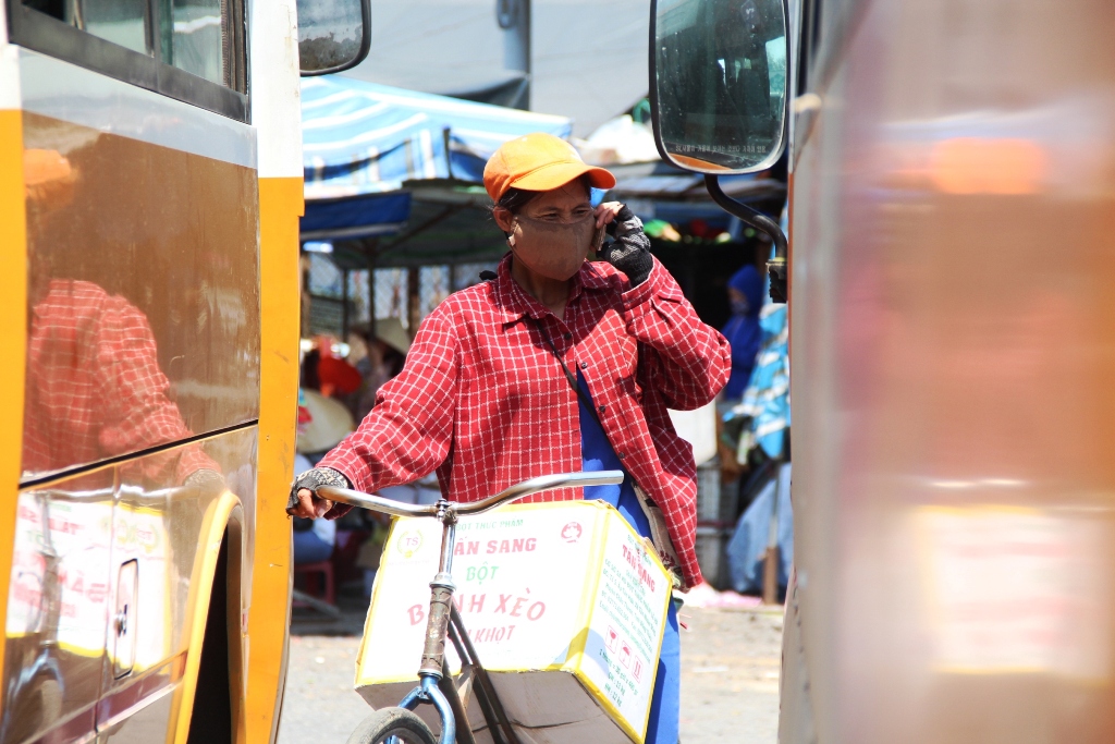 Chị Võ Thị Chót, người thồ hàng bằng xe đạp đang điện thoại cho khách để giao hàng đi theo các tuyến xe buýt. Chị Chót năm nay 46 tuổi, nhà ở phường Hương Sơ, TP. Huế