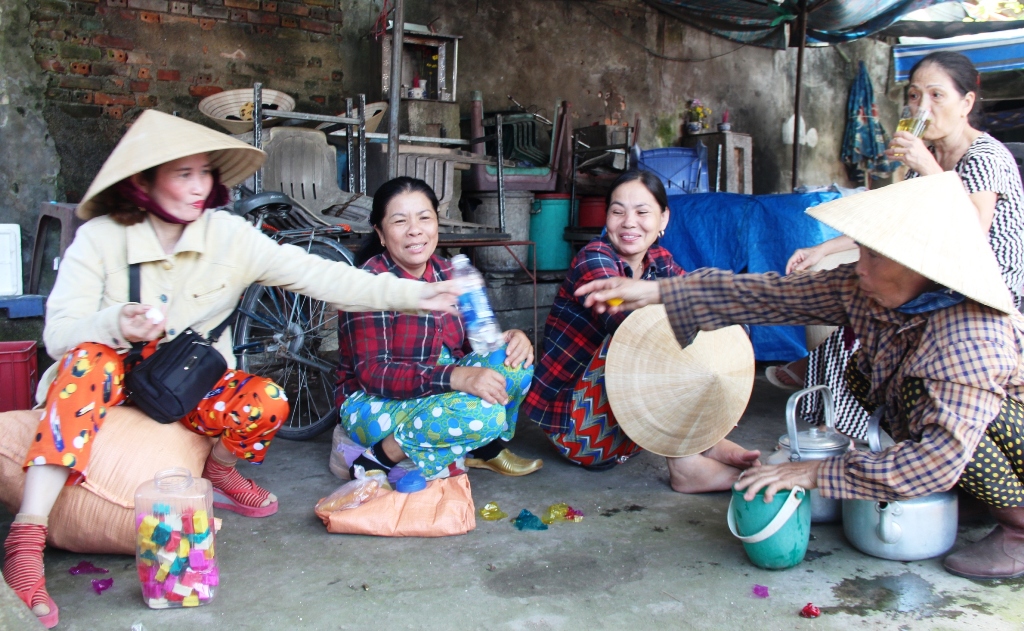 Phút thảnh thơi của các mẹ, các chị sau giờ lao động mệt nhọc. Cứ khi ngồi lại với nhau, những câu chuyện về gia đình cuộc sống lại được các chị bàn tán rôm rả
