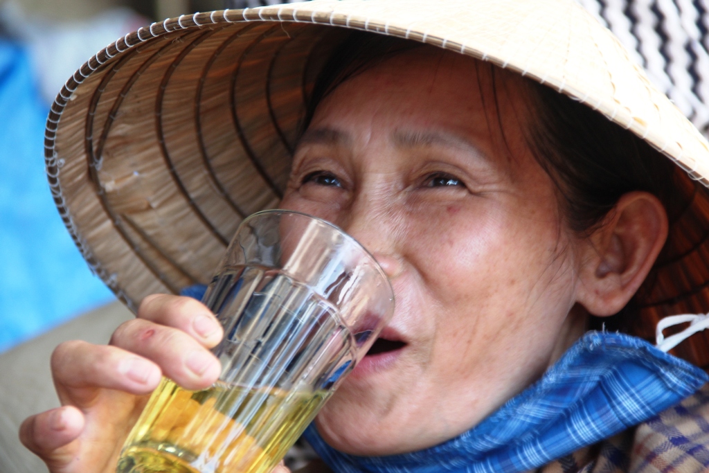 Nụ cười sảng khoái của chị Bông trong lúc uống cốc trà đá do chính tay mình tự pha. Bán trà đá cũng chính là nghề của chị Bông mưu sinh dọc theo đường Trần Hưng Đạo, TP. Huế