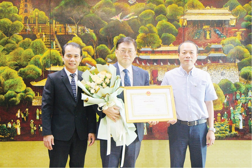 | Ông Cho Han Deog, Giám đốc Quốc gia Văn phòng Cơ quan Hợp tác Quốc tế Hàn Quốc (KOICA) tại Việt Nam (giữa) vinh dự nhận Danh hiệu “Công dân danh dự TP. Huế” (*) |