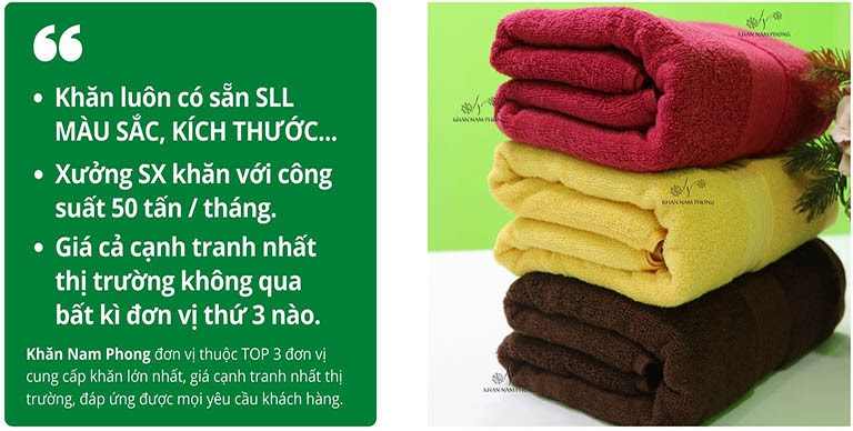 Vì vậy khi lựa chọn Nam Phong, khách hàng sẽ có cơ hội mua khăn tắm chất lượng với giá gốc ngay tại xưởng. Hoàn toàn không thông qua đơn vị thứ 3 nào.