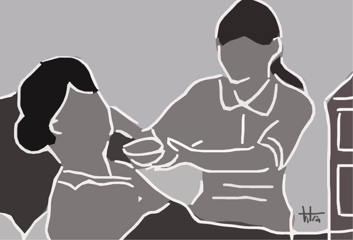 Bà nội của bọn trẻ đã bị lẫn, không còn nhớ con, nhớ cháu, đang “phản đối” không chịu ăn. Người đàn ông - cha của các con chị vất vả bón cháo cho mẹ. Con gái chị đỡ bát cháo trong tay cha, vừa nói chuyện vui chọc cho bà nội cười, vừa bón từng thìa cháo một cách gọn ghẽ.