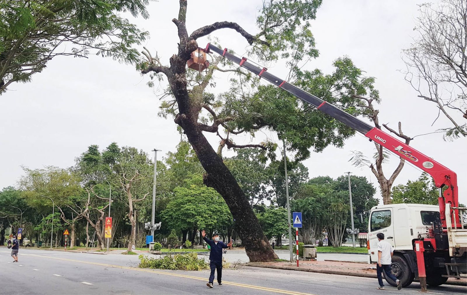 Mất một hồi hội ý, ông Đặng Ngọc Quý, Phó Giám đốc Trung tâm CVCX Huế cùng với các thành viên đội cắt tỉa cây xanh đưa ra quyết định sẽ cưa một số cành trên cao ngả hướng ra mặt đường. Sau khi chặn đầu xe hai phía, công nhân Nguyễn Quốc Toàn nhanh nhạy nhảy vào thùng chiếc xe cẩu. Bên trong một chiếc cưa máy công suất lớn đã được đặt sẵn. Chiếc cần cẩu từ từ được điều chuyển lên cao, dịch dần vào vị trí cần cưa cành cây. Cứ thế, cho đến khi anh Toàn đưa ngón tay cái ra chỉ dấu “OK”, người điều khiến cẩu phía dưới sẽ hiểu ngay đã đúng vị trí.