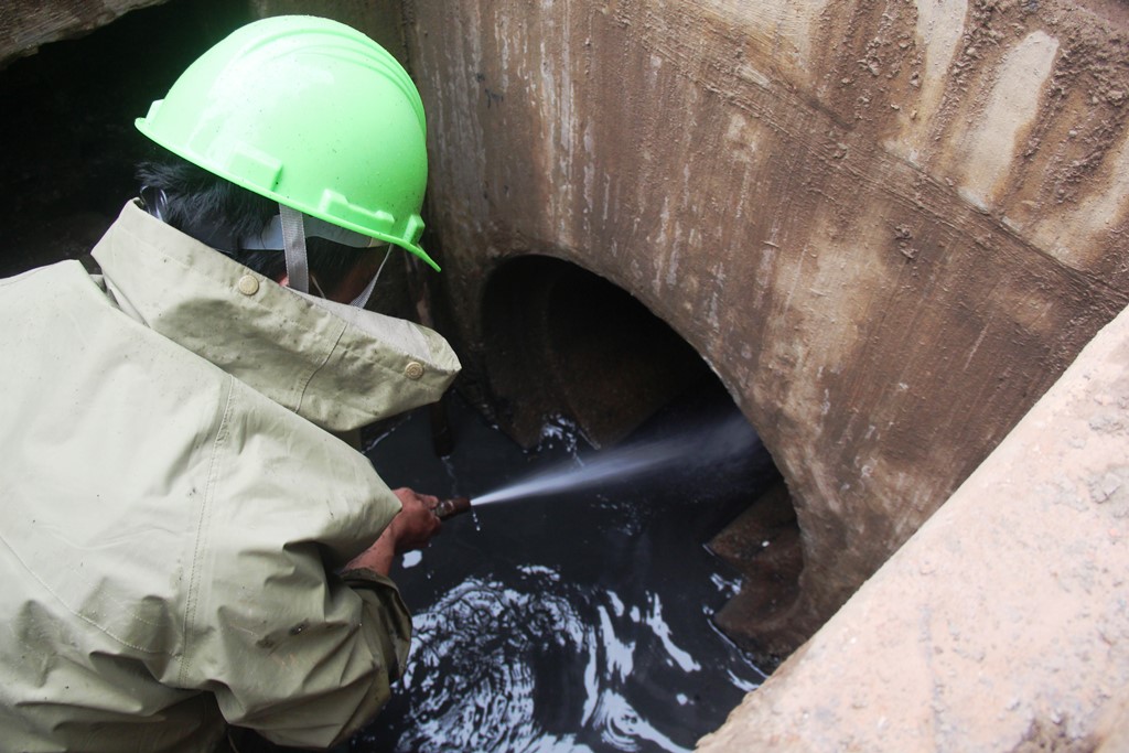 Xong phần dọn dẹp rác, ông Xuân hì hục “chui” lên mặt đất. Một đồng nghiệp trẻ khác, thay ông Xuân nhảy xuống. Bên trên, chiếc xe chuyên dụng di chuyển đến gần miệng cống. Bằng một vài thao tác nhanh gọn, đường dây phun nước phản lực được kéo xuống. Người công nhân nắm lấy rồi lần lượt chui sâu vào bên trong và thao tác phun mạnh. Dòng nước chảy ngược ra miệng cống. Mất một lúc chừng 15 phút, đường ống dẫn ra miệng cống thông suốt, không còn mùi hôi. Khi đậy lại nắp cống, thao tác phun nước phản lực cũng được thực hiện, đảm bảo vệ sinh, sạch sẽ cho tuyến đường.