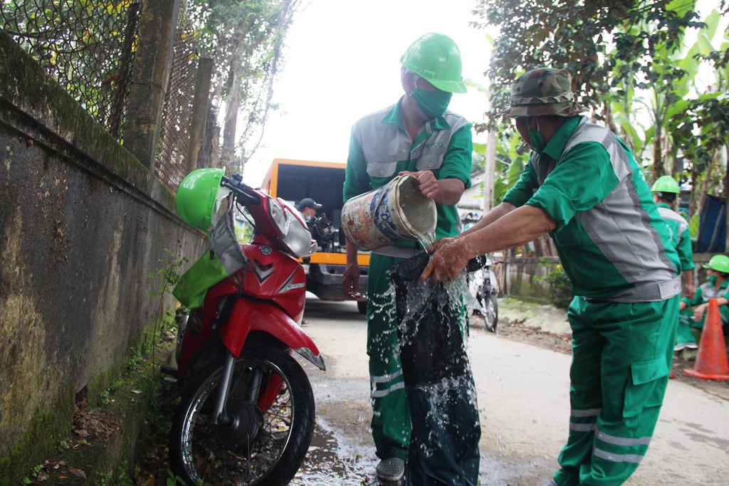 Sau khi xử lý xong một tuyến đường, các công nhân lại hỗ trợ nhau làm vệ sinh đồ bảo hộ cũng như thân thể. Dù vất vả, đối mặt với nhiều hiểm nguy nhưng các công nhân làm nghề này coi đó là trách nhiệm và niềm đam mê nghề nghiệp