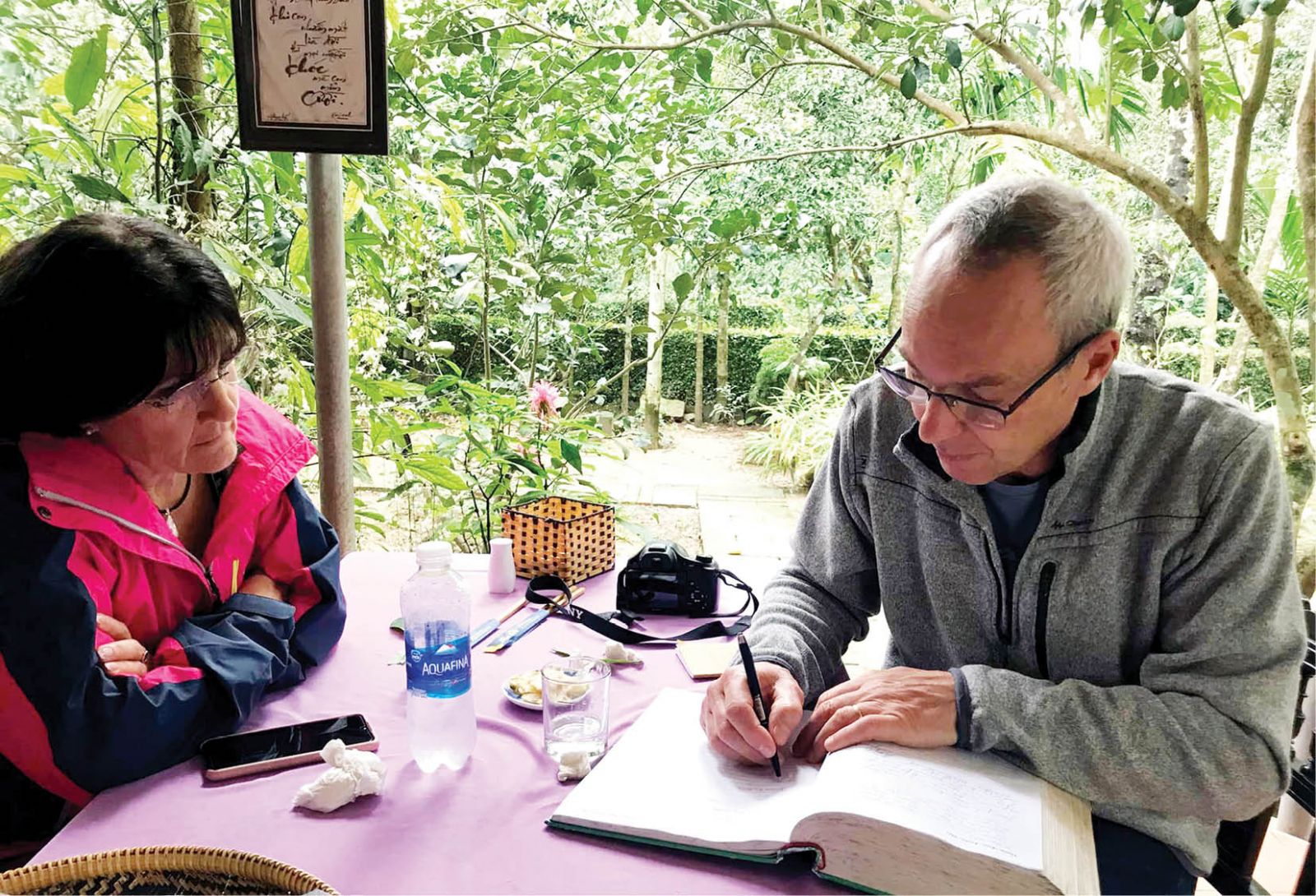 Du khách viết lưu bút vào quyển nhật ký thứ 3 của ông Đài