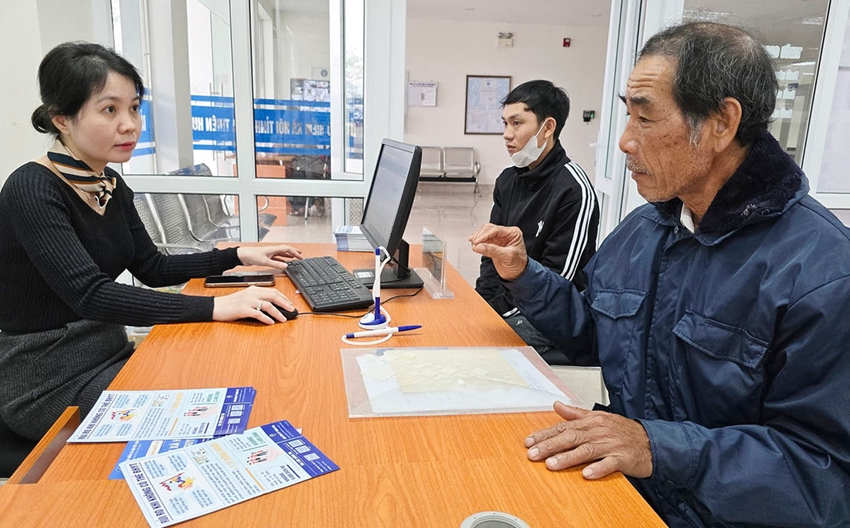 | Ông Trương Đình Bảy (ngoài cùng, bên phải) đến BHXH thành phố Huế làm thủ tục để tiếp tục tham gia BHXH tự nguyện vào thời điểm cuối tháng 12/2024 |