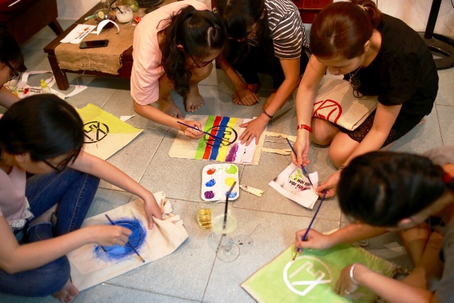 Tối 8/4, chương trình "Vẽ trên túi vải - nói không với túi nilon" lần đầu tiên diễn ra tại không gian của Then café. Khởi xướng chương trình này là Hoàng Phan Bích Ngọc, cán bộ trẻ của Khoa Công nghệ Sinh học - Viện Tài nguyên Môi trường.