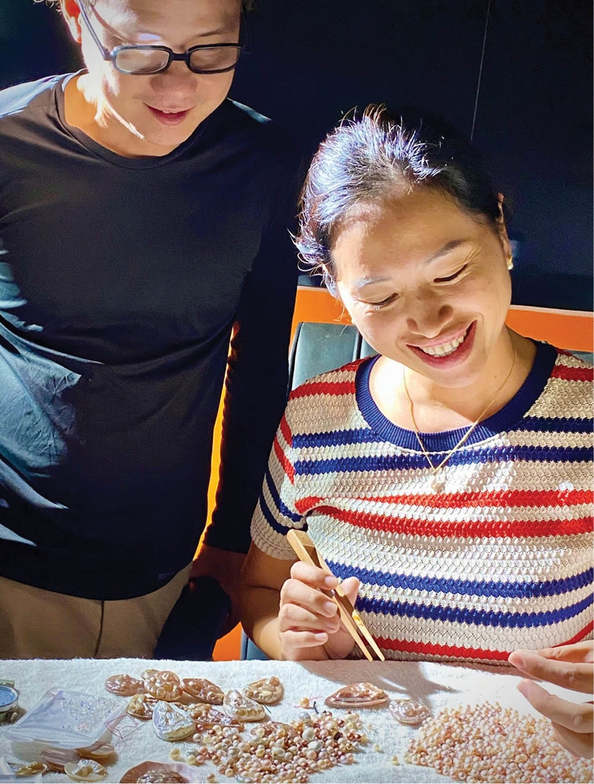 | Vợ chồng Phạm Đức Bằng - Trương Thị Mỹ Dung kiểm tra chất lượng ngọc trai |