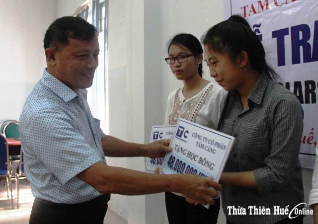 Ngay sau một ngày khảo sát, đoàn mời các em lên TP. Huế và trao học bổng 1 triệu đồng/tháng trong suốt 4 năm học (48 triệu đồng/người) trong khán phòng ấm cúng mượn nhờ trụ sở Hội Nhà báo tỉnh. Riêng Loan còn được tặng một máy tính xách tay để phục vụ cho khối học kỹ thuật. “Chẳng biết nói chi hơn, tụi cháu xin cảm ơn chân thành đến chú Vinh cũng như những tấm lòng hảo tâm. Tụi cháu xin hứa sẽ học thật giỏi, ra trường kiếm được việc làm để tự lo cho bản thân, gia đình và nếu được, sẽ trả lại món nợ ân tình cho thế hệ mai sau”, Kim Loan đại diện các bạn tâm sự. Khi Loan phát biểu, ngồi cạnh đó, Oanh thì thầm: “Vậy là từ nay em có thể yên tâm để học, khỏi lo sợ đứt gánh giữa đường”.