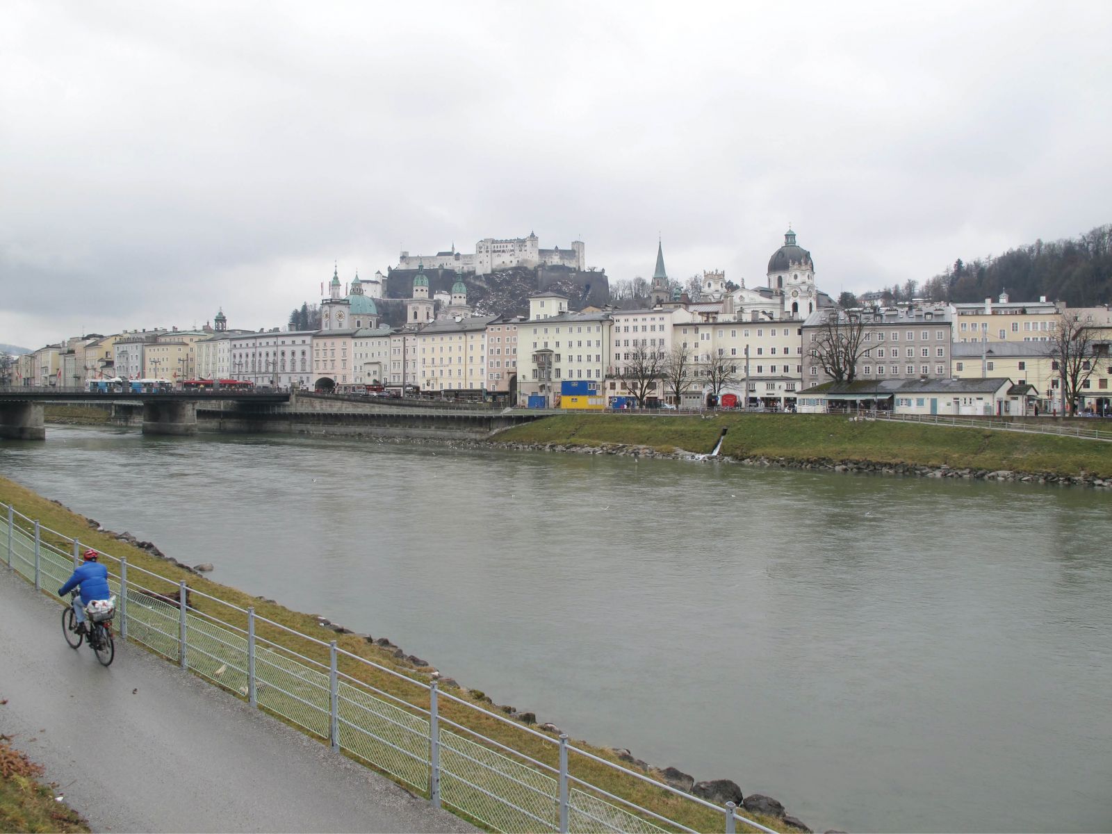 Dải bình nguyên dọc đường không còn ngút ngàn màu xanh cỏ cây với những ngôi nhà gỗ nép mình bên những góc đường làng tĩnh lặng đẹp mê hồn trong các trang mạng lữ hành. Từng mảng tuyết lấp lánh bên các sườn núi. Trên các ngọn đồi, cây cối khẳng khiu trơ cành trụi lá in lên nền trời tro xám. Co ro trong hai lớp áo ấm, tôi lang thang dọc bờ sông buôn buốt gió. Con sông Salzach thơ mộng “như chạy vội từ rặng núi xuống” chia đôi Salzburg thành hai nửa: Khu phố thời Trung cổ là Di sản thế giới từ năm 1997 và khu phố mới đường sá thoáng rộng được xây dựng từ thế kỷ 19. Sông dài chừng 140 dặm, là phụ lưu hữu ngạn của sông Inn nằm giữa Đức và Áo, điểm cuối đổ ra dòng sông Danube lừng danh. Nước sông xanh lững lờ soi bóng những cung điện, lâu đài kỳ vỹ, những ngôi giáo đường nguy nga cổ kính hai bên bờ, đã hằng bao thế kỷ trôi qua mà cảnh vật vẫn như ngày nào; tất cả còn nguyên nét hoài cổ, nhịp sống tĩnh lặng chậm rãi chưa bao giờ bị bào mòn hay phá lối bởi những trào sóng công nghiệp hiện đại…, như có lữ khách từng ví “một thiên đường đang say ngủ”.