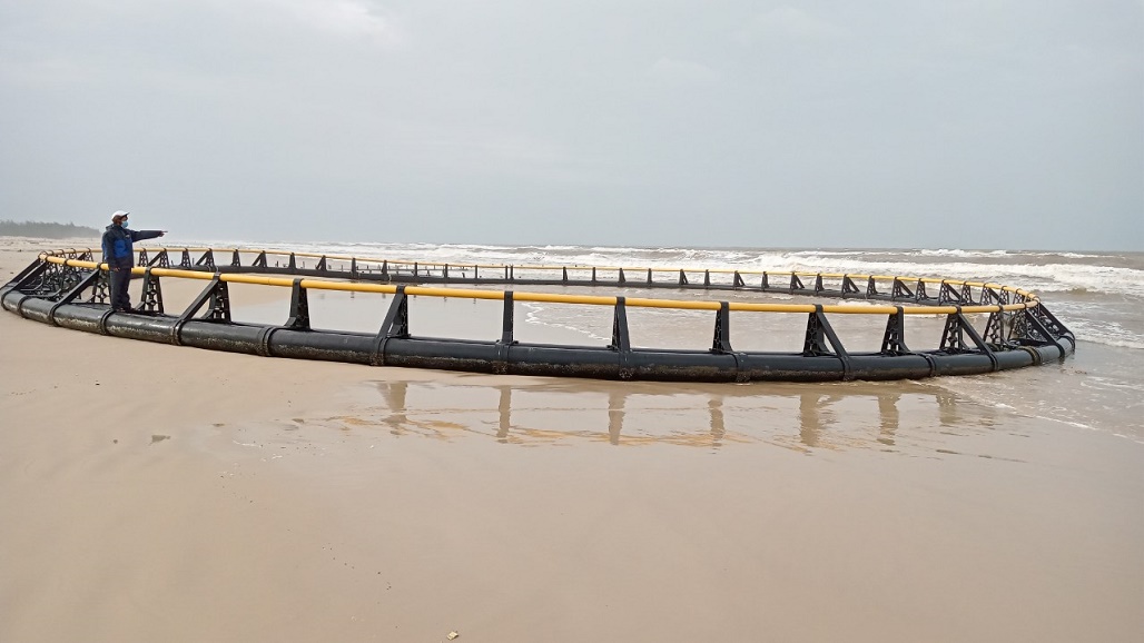 Vật thể trôi dạt vào bờ biển hình tròn với đường kính khoảng 30m, được kết cấu bằng nhựa và ống nhựa to, trên ống nhựa ghi chữ Trung Quốc.