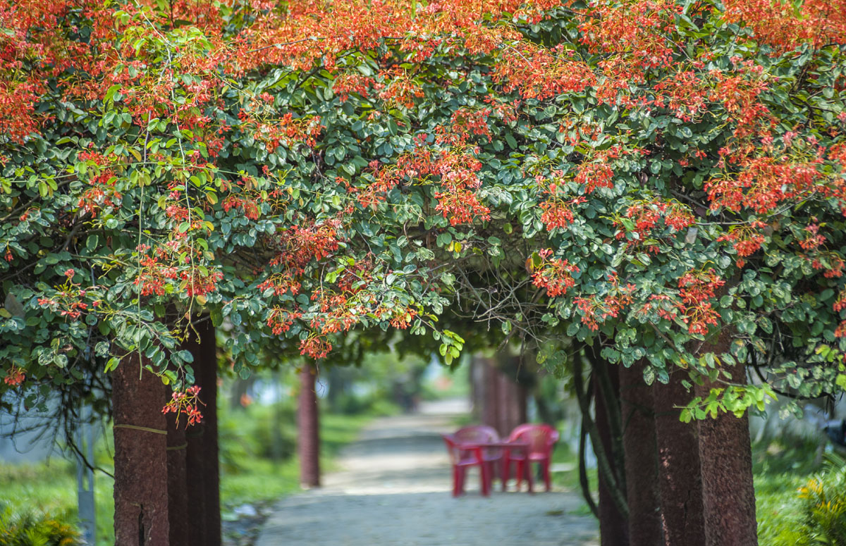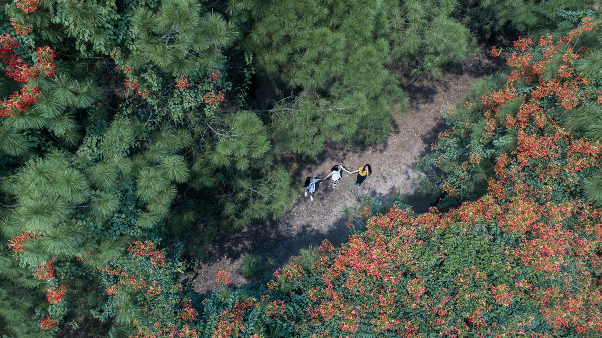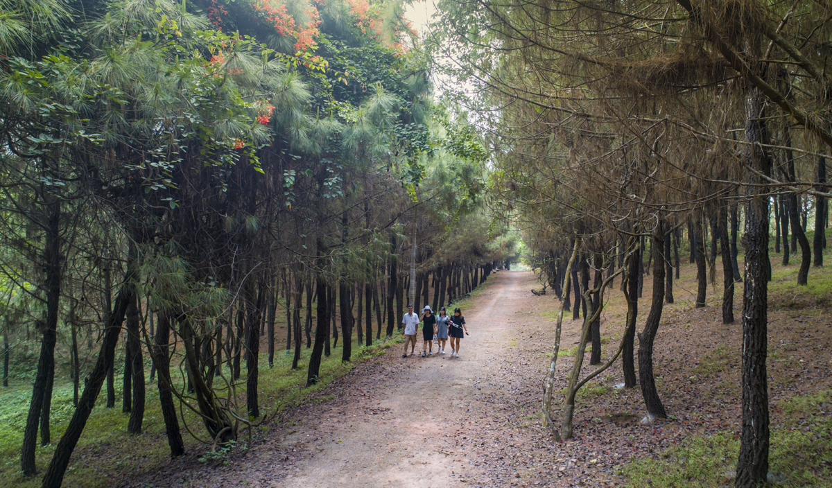 Con đường thơ mộng với hàng thông được tô điểm thêm màu đỏ phượng rừng