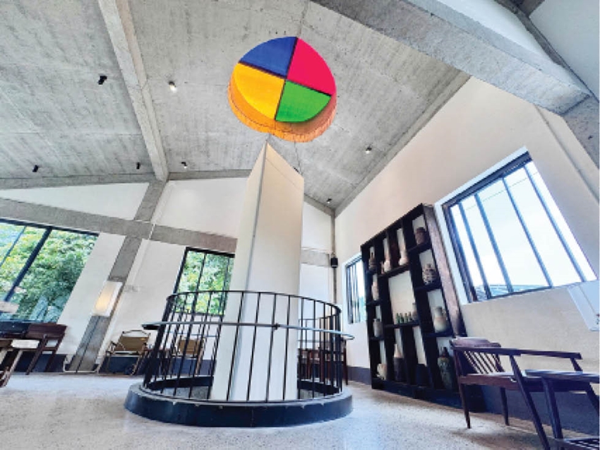 Tôi ấn tượng nhất là khu nhà được xây thoáng đãng, vững chãi, giàu tính kết nối nhưng rất độc đáo, cách tân ở phía sau. Khác với khu nhà gỗ mang nét hoài cổ ngay lối cổng vào, căn gác mái phía sau mở ra những trải nghiệm khác biệt với mái trần nguyên bản là những khối xi măng. Mảng trần màu xám mộc mạc không được tô trét gợi cảm hứng về sự tối giản, tự do. Tuy nhiên, để tạo điểm nhấn, giảm bớt vẻ lạnh lẽo của sắc xám xi măng, chủ nhân công trình đã chọn treo vào trần nhà một dàn đèn gồm bốn gam màu sáng ấm.