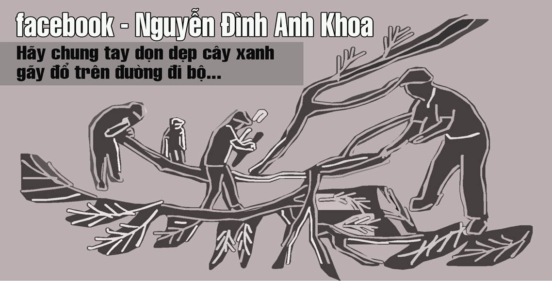 Tôi cũng thấy sau lời kêu gọi của Khoa, có rất nhiều hội, nhóm khác, từ thanh niên đến các hội chị em đi xe đạp, hội chèo thuyền Sup, hội thể dục nhịp điệu... chung tay gom cây đổ ngã ở các tuyến đường giúp công nhân cây xanh, môi trường chở về nơi tập kết... Và không thể không kể đến vai trò của các đoàn viên thanh niên, lực lượng công an, bộ đội, dân quân tự vệ, công nhân môi trường, cây xanh và người dân-họ là lực lượng nòng cốt trong những ngày qua đã xuống đường từ rất sớm để dọn cây, cắt cành… giúp đường phố sớm thông thoáng trở lại.